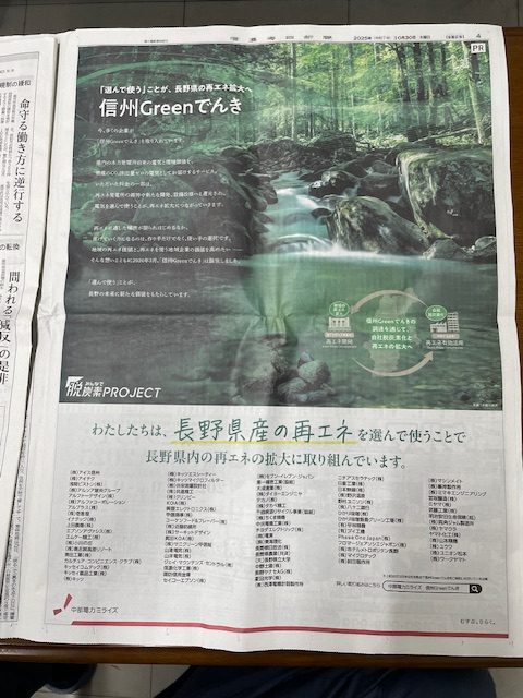 news release 7 投稿日: 2025年10月30日2025年10月31日 投稿者: UNION MATSUMOTO (2025/10/30) 本日の信濃毎日新聞に、 弊社も取り組んでいる、 「信州グリーン電気」の広告が掲載され、 ちょこっと名前を載せていただきました。 右隅にひっそりと、 他の会社様に交じってひっそりと・・・。 地球が暑くなっていることは、 この夏も体感で感じていて、 少しでも貢献できれば、 そんな思いで参加しております。